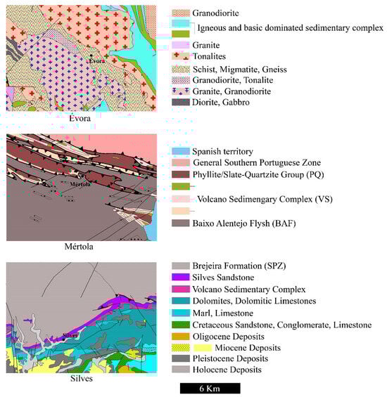 Adapted geological maps of the cities of Évora, Mértola, and Silves. Maps were downloaded from the website of the National Laboratory of Energy and Geology (Geoportal-LNEG-Portugal). The scale is 1:500,000 (elaborated by Massimo Beltrame).