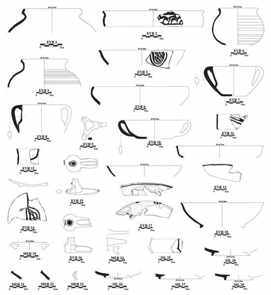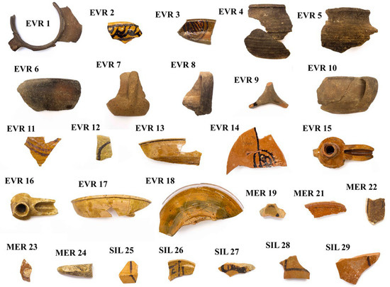 Mineralogically, it was characterized by the presence of muscovite (very abundant in the ceramic matrix), quartz, potassium-rich feldspar, and plagioclase feldspar (rare). Brown amphibole could also be observed in some samples (EVR 2 and MER 19). Quartzite, greywacke, and chert rock fragments could be also indistinctly recognized in each sample.