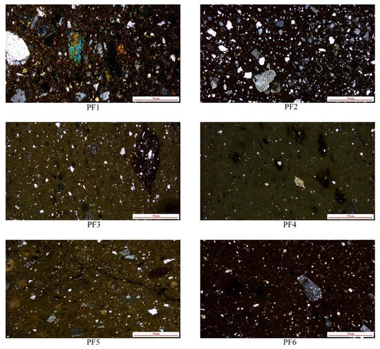 Samples were divided into six pottery fabrics (PFs). The compatibility with the geological settings of each area was also assessed. The petrographic characteristics of ceramic samples are resumed in a specific Supplementary Materials, and Figure 5 and Figure 6. Follow the description of each PF.
