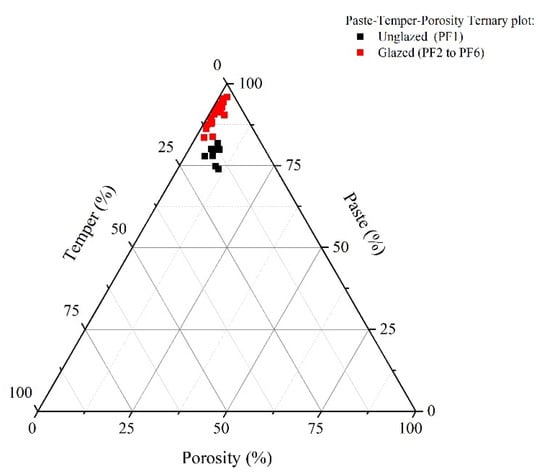 Unglazed and glazed ceramic samples plotted on the Paste-Temper-Porosity ternary plot.