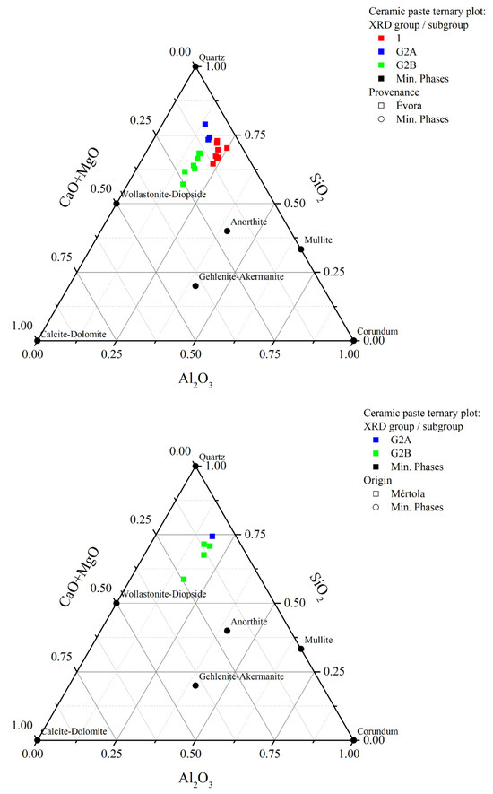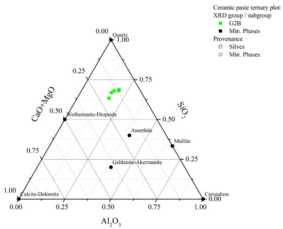 On the ternary plot presented in Figure 7 and Figure 8 [50], specimens are distributed as a function of (CaO + MgO) − Al2O3 − SiO2 abundance, and the mineralogical phases that should crystalize in the ceramic paste, when the piece is fired at a maximum of 1100 °C under oxidizing conditions, are highlighted.