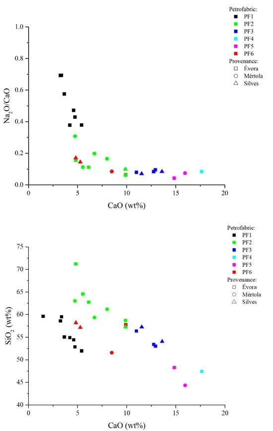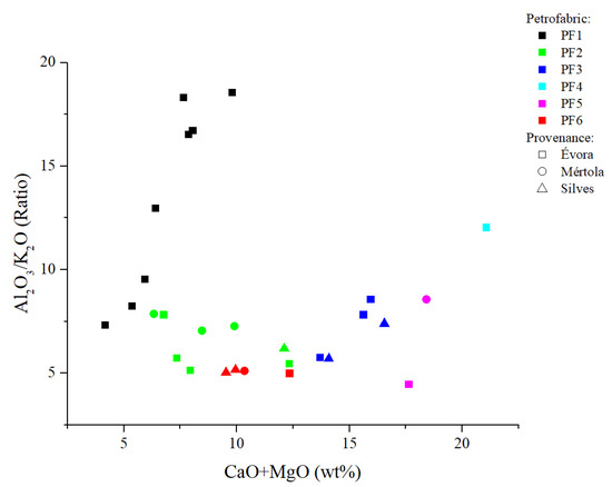 The mineralogy (quartz, plagioclase feldspar, potassium-rich feldspar, muscovite) and rock fragments (quartzite, sandstone) identified in PF2 and PF3 samples point out the affinity to the geological setting of the Silves area. The alteration products of the Silves Sandstone were probably employed for ceramic production. Similar results were obtained in a previous study [25]. Although similar minerals and rock fragments were identified in PF2 and PF3 samples, the identification of lime nodules and clay pellets suggests that the raw material exploited was probably heterogeneous, or different raw materials were mixed. A difference in the color of the ceramic paste of samples has also been observed. So, raw material heterogeneity or different raw material mixing probably influenced the samples’ paste carbonate component abundance. Additionally, the ceramic paste of PF3 samples is generally lighter in color, suggesting that the carbonate component is slightly higher than PF2.