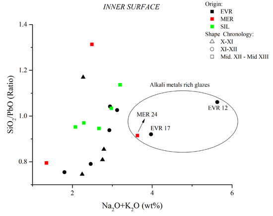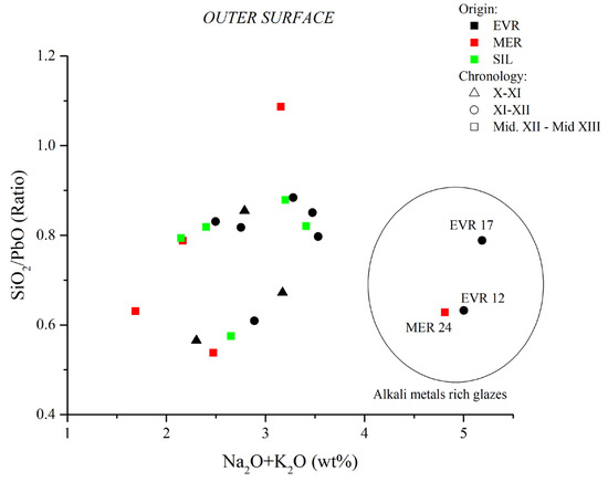 The first evidence of Islamic glazed ceramic production in the Iberian Peninsula (i.e., al-Andalus during the Islamic Middle Ages) was documented at Pechina, Málaga, and Córdoba during the late Emiral period (end of the 9th/early 10th century AD) [1,2,3]. The production technology was characterized by the use of lead oxide (PbO), as the main fluxing agent, and silica (SiO2) to produce high-lead glazed ceramics. The procurance of lead was diverse but, preferentially, galena ore deposits from the southeast of the Iberian Peninsula were largely quarried as a naturally occurring mineral [4]. The contribution of alkaline earth metals (i.e., Na2O and K2O) as fluxing agents was generally low [5].