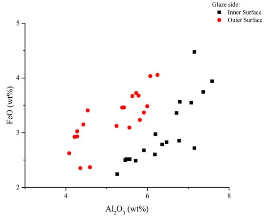 The chemical composition of clean (i.e., without any crystallite when present) black/brown decorated areas on homogeneous and heterogeneous glazes determined the variable contribution of FeO (1–10%) and MnO (1–3%), indicating that different pigments could be mixed together and applied. Nevertheless, on homogeneous glazes, considering that the decoration was applied over a honey-colored glaze and the addition of a different component to the glaze mixture has been assessed (see Section 4.4.1 and Section 4.4.3), it is not possible to determine to what extent FeO-rich raw material was utilized as a pigment. In any case, it is possible to affirm that a MnO-rich raw material was surely added to the decoration, as it was never detected on the honey glaze (see Section 4.4.1).