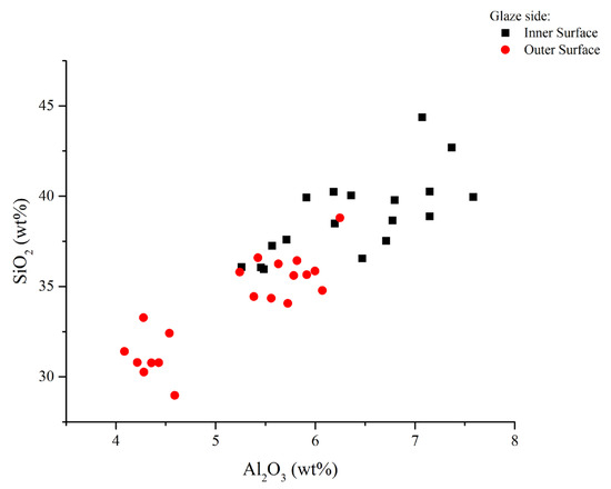 SEM-EDS has been utilized to determine the glaze technology applied (i.e., glaze chemical composition, application technique, firing technique, and decoration characteristics). The work was developed using a variable pressure SEM-Model HitachiTM S-3700N coupled to an EDS-BrukerTM XFlash 5010 Silicon Drift EDS Detector® (Hitachi, Tokyo, Japan) with a spectral resolution of 129 eV at FWHM/Mn Kα. Analyses were performed at a 20 kV acceleration voltage, 120 µA, and a pressure of 40 Pa in the chamber. The chemical data obtained were converted into oxides by stoichiometry and normalized to 100% using 3 different replicates. In the case of spot analysis, just one measurement was performed. In this case, the associated statistical error is 1 sigma. Esprit 1.9 software by BRUKER was utilized to acquire and interpret SEM-EDS data.
