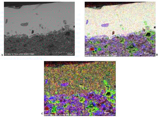 Considering the identification of illite/muscovite in some samples (i.e., dehydroxylation normally occurs above 950 °C) and the development of calcium-rich mineralogical phases during firing [32,46,47,48,49,50,54,56], the firing temperature range of the G2B subgroup can be settled between 950 and 1100 °C.