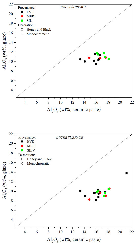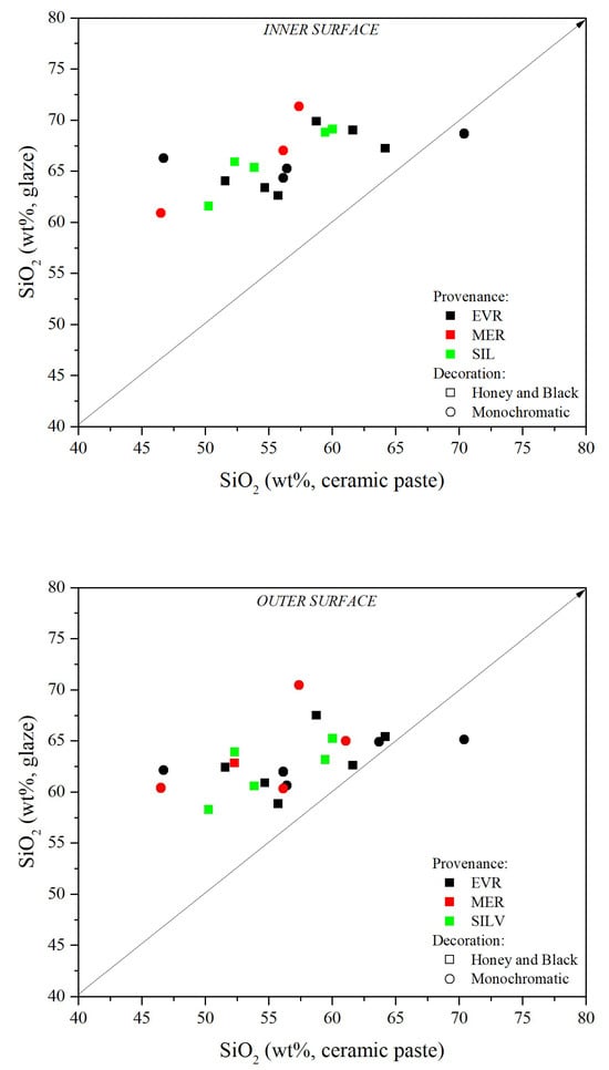 Therefore, the characterization of Islamic glazed ceramics from the cities under study not only has the potential of adding new information regarding ceramic and glaze technology in Évora during the Islamic period, but it will also make it possible to evaluate trades and consumption trends over the given timeframe between the selected cities and, more generally, in the Gharb al-Andalus. Results are compared to and evaluated with the most recent bibliography in this field of study within the region [1,2,3,5,6,8,9,10,11,13,14,15,16,17,18,19,20,21,22,23,24,25] and other areas [26,27].