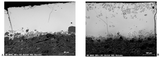 Glaze technology was evaluated following the guidelines proposed by different authors [5,8,10,52,53]. Specifically, the firing technology was examined by observing glaze/ceramic paste interfaces [53], whereas the glaze application technique was assessed according to the method proposed by [52].