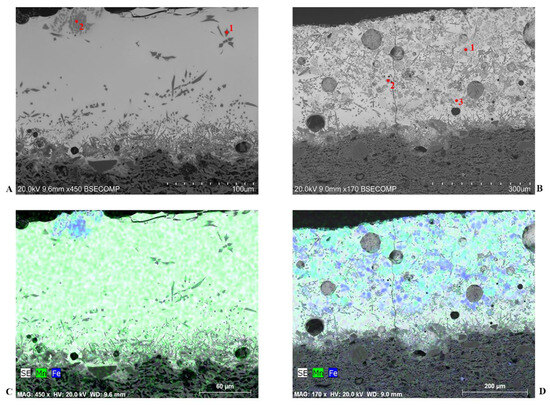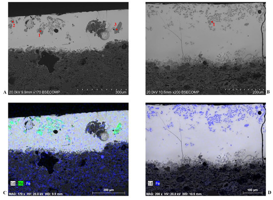 In addition to hematite crystals, SEM-EDS also identified two more different crystallites, which generally show different contrasts in BSE pictures. In the first one (Figure 18B, spot 1), FeO (44.68 wt%) is more represented than MnO (15.63 wt%). So, based on chemical contrast (i.e., low) and composition, these inclusions are probably iron and manganese oxides, and they can possibly be classified as jacobsite (MnFe2O4). This inclusion type is generally crystallized during firing by the combination of manganese- and iron-rich raw materials [12].
