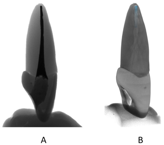 Standard right central incisor for root canal treatment training. (A) Tomographic image produced using micro-CT; (B) resultant image after importing slices to Simpleware.