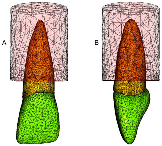 In this study, all of the materials were considered to be isotropic and homogeneous, and have linearly elastic mechanical properties. Although materials such as gutta-percha and cancellous bone present nonlinear viscoelastic behavior in clinical scenarios, which is a time-dependent viscoplastic phenomenon, simplification in material properties and also in the morphology of the components of the models is common in FEA. In static loading simulations, as in the current study, homogeneous isotropic material properties can provide acceptable results [26]. Two materials were selected for the customized post–core structure. Nickel–chromium (NiCr) was chosen as a control due to its traditional use as a one-piece post–core in endodontic practice. Pure PEEK was chosen for showing beneficial mechanical behavior, decreasing the stress concentration in all of the components of the models in previous FEA studies [1] when compared with traditional materials. The Young modulus and Poisson ratio of the materials assigned to the respective components of the mesh volumes can be seen in Table 1 [1,15,27,28,29,30,31,32].