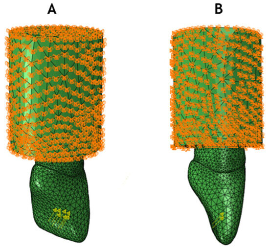 Boundary and load conditions. Constricted nodes are represented in orange, while the load direction and location are represented by yellow arrows. (A) Lingual view; (B) lateral view.