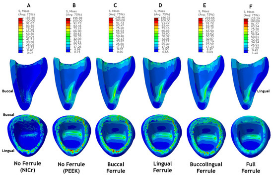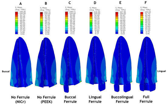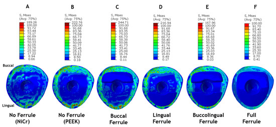 Transverse plane view of stress distribution contour plots of ferrule and root model components. Models: (A) No Ferrule (NiCr); (B) No Ferrule (PEEK); (C) Buccal Ferrule; (D) Lingual Ferrule; (E) Buccolingual Ferrule; and (F) Full Ferrule.