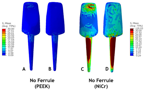 The post–core components of the models showed peak stresses located in the core region, in contact with the tooth structures. The No Ferrule (PEEK) model showed a significant 82 percent reduction in von Mises peak stresses when compared with the No Ferrule (NiCr) model, with values of 22 MPa and 126 MPa, respectively (Figure 6). The cited contour plots of the models are depicted in Figure 10. The stress distribution in the PEEK post–core component (Figure 10A,B) was more uniform, homogeneous, and concentrated in the cervical part of the post–core structure, while in the post–core made of NiCr (Figure 10C,D), it demonstrated high stress concentration along the middle third of the post and under the applied load region. The PEEK post–core components in all of the tested models had values under 60 MPa: the Full Ferrule model had the lowest value (6 MPa), followed by the BL ferrule with 16 MPa and No Ferrule (PEEK) with 22 MPa, and then the Buccal (30 MPa) and Lingual (59 MPa) Ferrule models.