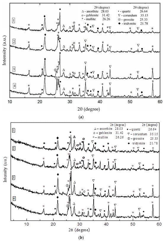 Meanwhile, medium-cement castables have gained recognition for their capacity to maintain consistent quality even under varying manufacturing conditions, setting them apart as a favorable choice for biofuel boiler installations [,]. While the lower porosity of castables can undoubtedly enhance their durability within alkaline environments, it is important to acknowledge that over time, alkali may still infiltrate the castable structure and engage with aluminosilicate aggregates []. One promising avenue for mitigating alkali-induced damage involves the addition of ground quartz sand to fireclay refractory castables, a practice known to stimulate the formation of a protective glassy layer on the castable surface when subjected to alkali salts at elevated temperatures [,]. However, it is imperative to exercise caution when determining the quantity of the quartz sand added due to the polymorphic transformations of SiO2 that transpire at specific temperature thresholds [].