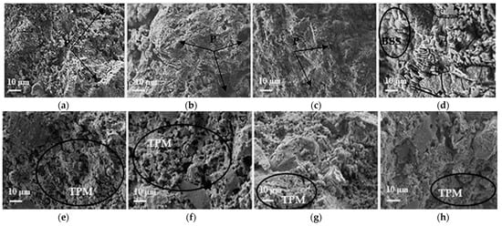 The images of control and impregnated samples (P—pore, BSS—blown sodium silicate, TPM—typical porous matrix): (a) CC-1- impregnated, (b) CC-2- impregnated, (c) MCC-1- impregnated, (d) MCC-2- impregnated, (e) CC-1 control, (f) CC-2 control, (g) MCC-1 control, (h) MCC-2 control.