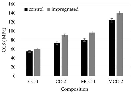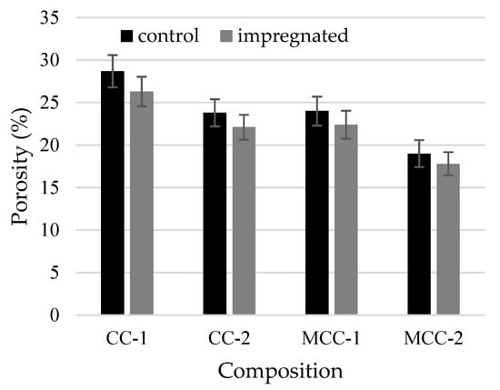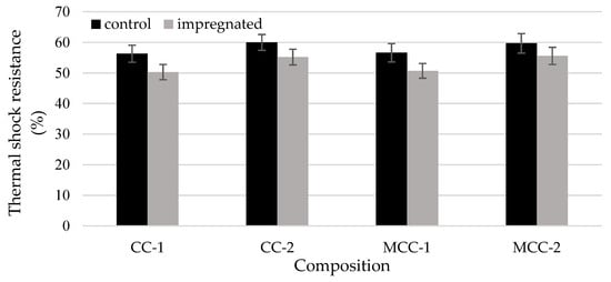 The thermal shock resistance (Figure 10) of the impregnated samples compared to the control samples decreased from approximately 8% (CC-2, MCC-2) to 12% (CC-1, MCC-1).