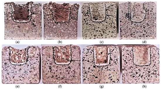 Milled quartz additive participated in the building of the protective barrier in the control samples as well, but after 20 alkali exposure cycles, this barrier became weaker and the samples expanded, leading to expansion caused deformations at the top of the samples (Figure 7a–d).