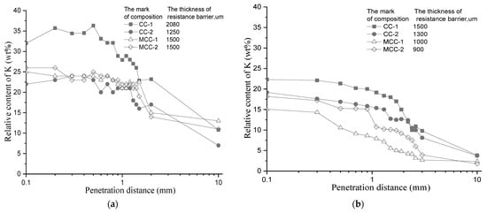 Relative content of potassium at different penetration distances: (a) control samples; (b) impregnated samples.