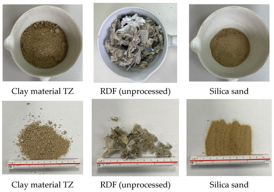 In the course of these experiments, silica sand was employed in conjunction with RDF, with the primary objective of reducing the size of the RDF particles through the use of a hammer mill. Silicon sand primarily consists of two main elements: oxygen and silica. More specifically, silica sand is primarily composed of silicon dioxide (SiO2). Quartz, a crystalline mineral constituted by silicon dioxide, is known for its chemical inertness and relatively high hardness, rating 7 out of 10 on the Mohs hardness scale [16]. The selection of this particular type of sand, denoted as ZK, was driven by its finer texture and its absence of unwanted additives, making it a preferable choice over sea sand or sandy clays All the tested materials can be seen in Figure 1.