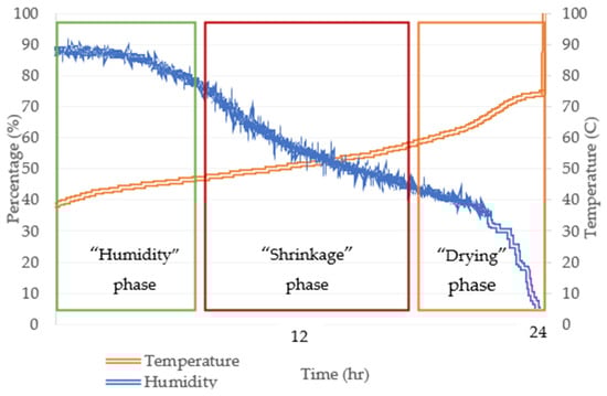 To establish steady-state testing conditions, the air fan and electrical heater were initially engaged. Subsequently, a green brick sample was placed on the metallic carrier. Throughout the experiments, the humidity level of the drying air was meticulously monitored. Relative humidity within the dryer was measured every 5 min using a humidity sensor (TMI Orion—CeriDry), adhering to the precise measurement procedures and methodology outlined by Makrygiannis and Karalis [23]. The drying sensitivity level was determined by the CSB index, an indicator of drying sensitivity according to Bigot. The classification of sensitivity levels is presented in Table 8.