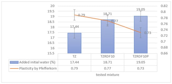 The difficulties encountered during cutting were primarily attributed to the size of the RDF particles. The cutter wire tended to catch and drag the larger RDF pieces, resulting in elevated pressure on the loam material. This, in turn, led to significant stresses, hindered the cutting of specimens, and even caused the detachment of material along the cutting edges. These issues highlighted the unique challenges posed by the presence of unprocessed RDF within the mixture, particularly when it came to the precision of the cutting process (Figure 4). The plasticity and the necessary water for all mixtures can be seen in detail in Figure 5.