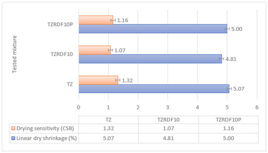 The drying results of this study revealed a reduction in sensitivity when RDF (Refuse-Derived fuel) was incorporated into the mixtures. The decrease in sensitivity, as shown in Figure 6, was more pronounced in the case of mixtures containing unprocessed RDF, although it was not significantly different compared to the mixtures with processed RDF. This indicates that both types of RDF had a mitigating effect on sensitivity during the drying process.