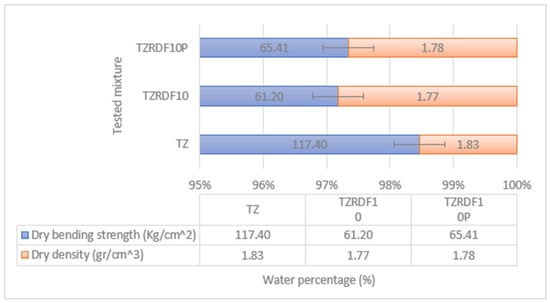During the extrusion process, it was observed that the mixture containing processed RDF exhibited a noticeable increase in the plasticity of the wet mixture, requiring approximately 1% more extrusion water compared to the 100% clay mixture. Conversely, the mixture containing unprocessed RDF (TZRDF10) displayed better plasticity, requiring nearly the same amount of water as the reference mixture (100% clay—TZ mix) for extrusion. However, challenges emerged during the subsequent cutting phase, where the wet product was shaped into samples [25].