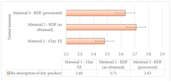 The investigation into the re-absorption of the dry product shed light on the impact of incorporating Recycled Demolition Waste (RDF) into construction mixtures. After subjecting samples of three different mixtures—the TZ mixture (100% clay), TZRDF10 (10% unprocessed RDF), and TZRDF10P (10% processed RDF)—to complete drying, the subsequent re-absorption of humidity over a 24-h period in room temperature conditions revealed noteworthy findings. The recorded re-absorption percentages of 2.48%, 2.71%, and 2.63% for the TZ, TZRDF10, and TZRDF10P mixtures, respectively, signify an increase in porosity induced by the incorporation of RDF, as can be seen in Figure 8. The elevated re-absorption percentages suggest that the introduction of RDF, whether processed or unprocessed, results in a more porous material structure, allowing for increased moisture uptake during subsequent exposure.