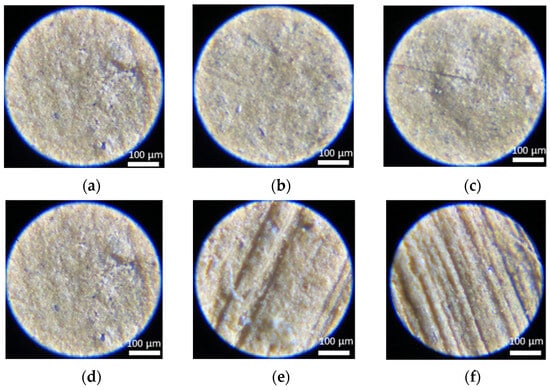 Examining the cutting areas of the brick samples in Figure 9d–f, the impact of the cutting process becomes apparent. The wire used for cutting the wet samples into the specified dimensions of 120 × 20 × 20 mm left distinct “scratches” on the surface cutting area. Notably, the surface of the ceramic material containing unprocessed RDF, as depicted in Figure 9f, appeared to be more rugged. This roughness suggests that the wire caused surface damage, resulting in a tactile perception of coarseness in the affected area. Overall, these observations underscore the influence of RDF processing on the surface characteristics of ceramic products.