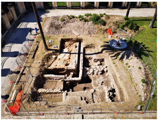 Due to maintenance work in 2018, significant archaeological remains were discovered on the “Cavallerizza” side of the internal garden of Palazzo Corsini alla Lungara (Figure 1).