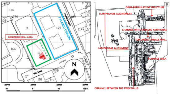 (A) Scale plan of the intervention area (red box) in the Cavallerizza courtyard (green) located in Palazzo Corsini alla Lungara (blue). (B) Detailed plan of the structures that emerged during the excavation (credit to Margherita Zannini).