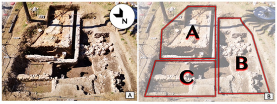 (A) Image of the archaeological excavation providing a general perspective of the structures discovered (credit to Veronica Romoli). The quadrants in (B) refer to the excavation areas where different materials and structures were found. Quadrant A indicates the area relating to the presumed furnace. Quadrant B indicates the area belonging to the location of the amphorae; Quadrant C indicates the area where there are walls of different eras.