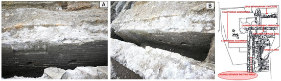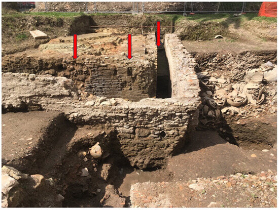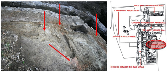 In the south-west sector of the area reported in quadrant A in Figure 3, two walls that could have been constructed later were discovered (Figure 6A).