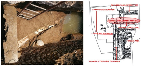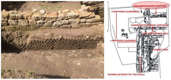 The furnace needed a large amount of water, which was essential for the control of fire and heat; the presence of a water channel around the floor could have been created not only as a function of channelling water resources, but also intentionally for the use of the furnace. The reason why this location was selected for the officine could be attributed to the presence of a clayey area, primarily composed of silty clays [16], which is suitable for the creation of artefacts, as well as the abundance of wood required for the kilns, whose supply was ensured by the proximity of the ports on the Tiber in the Trastevere area (port of Ripa Grande) and by the presence of numerous springs on the Janiculum that descended into the valley to flow into the Tiber. The region was thus in a particularly advantageous position for the supply of raw materials as well as for the transportation of finished products because of its close position to the river landings.