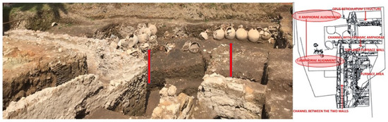 The excavations also led to the discovery of a double line of amphorae with east–west and north–west directions inside the excavated area (Figure 9).