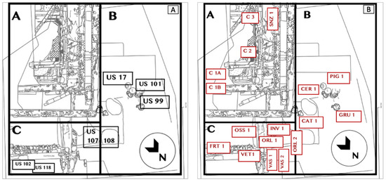 (A) Excavation plan with UUSS location for quadrants A, B, C and (B) location of the analysed materials (credit to Margherita Zannini).