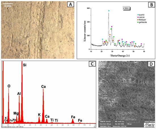 The observations in the optical and electronic microscopes of the bowl fragment CER 1 reveal that it has a homogenous morphology and a low porosity (Figure 11A,D). The EDS area analysis, carried out on the surface sample (Figure 11C, Table 2), revealed the presence of Si (20%), Ca (10.2%), and Al (7%) together with minor quantities of Fe, Na, Ti, and K. The XRD spectrum highlights the mineralogical phases present: quartz (SiO2), calcite (CaCO3), feldspar-albite (NaAlSi3O), and gehlenite (Ca2Al(AlSi)O7).
