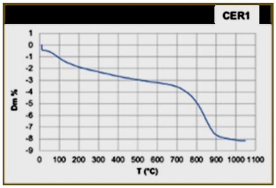 The thermogravimetric analysis highlights a weight loss in the material analysed between approximately 700 °C and 900 °C (Figure 15) due to the decomposition of CaCO3. The low weight loss in the initial section of the reported curve reveals a low presence of adsorbed water due to the waterproof property of the ceramic [19].