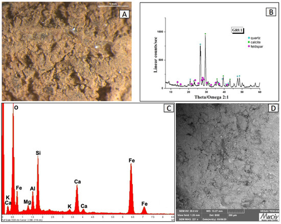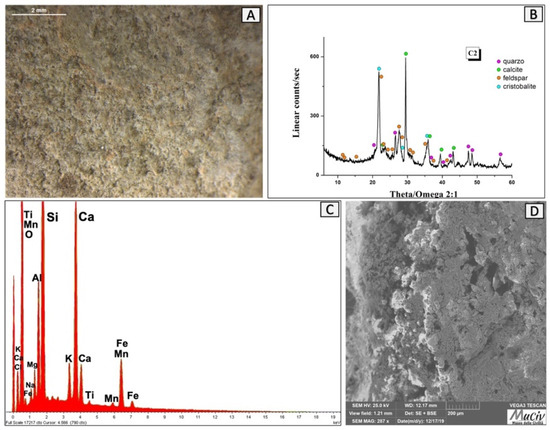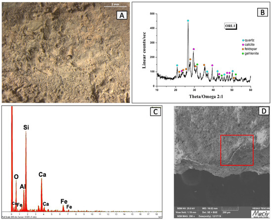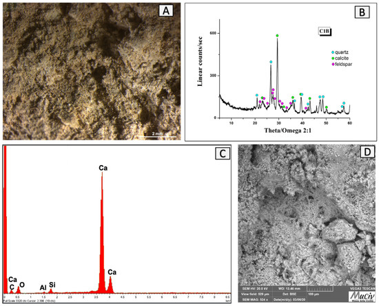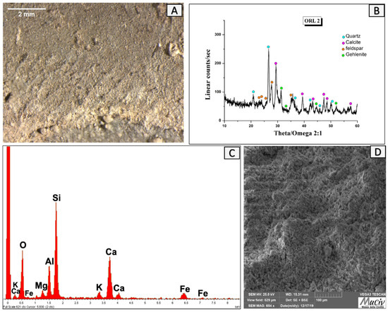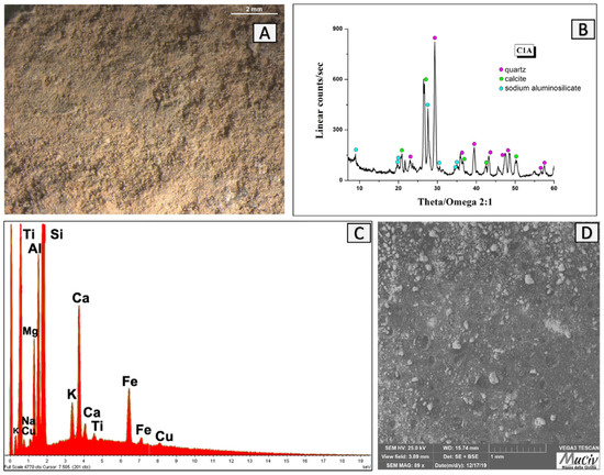 The XRD analysis (Figure 14B) revealed the presence of quartz (SiO2), calcite (CaCO3), feldspar-albite (NaAlSi3O8), and gehlenite (Ca2Al(AlSi)O7).