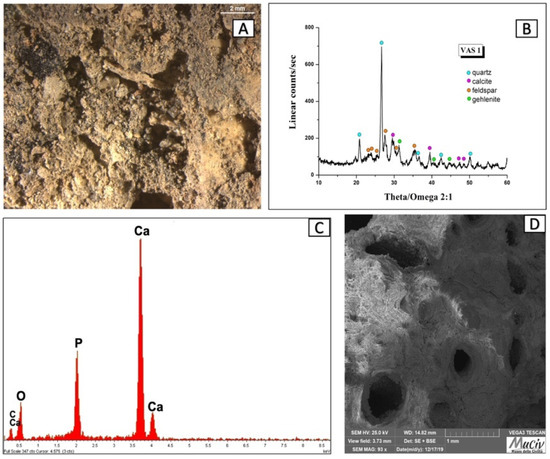 The OM image (Figure 16A) of the bowl fragment with bone remains (VAS 1) shows a ceramic item with a large grain size range. Figure 16B shows the XRD spectrum of the sample; the most sharp and intense peaks on the diffractogram are related to quartz (SiO2), calcite (CaCO3), feldspar-albite (NaAlSi3O8), and gehlenite (Ca2Al(AlSi)O7).