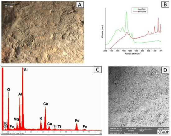 - Micro Raman (µ-Raman) analysis was performed at room temperature using a Renishaw RM2000 equipped with a Peltier-cooled charge-coupled device (CCD) camera, in conjunction with a Leica optical microscope with X10, X20, X50, and X100 objectives. Measurements were performed using the X50 objective (laser spot diameter of about 1 µm) and the 514.5 nm excitation line of an Ar+ laser using the equipped density filter with a real output of 300 µW. Raman analysis was carried out using RUFF online database (https://rruff.info accessed on 17 February 2023) and the GRAMS library.