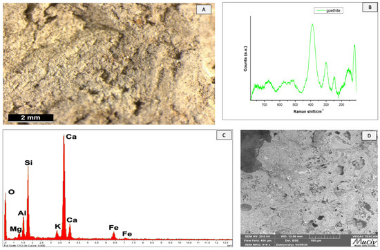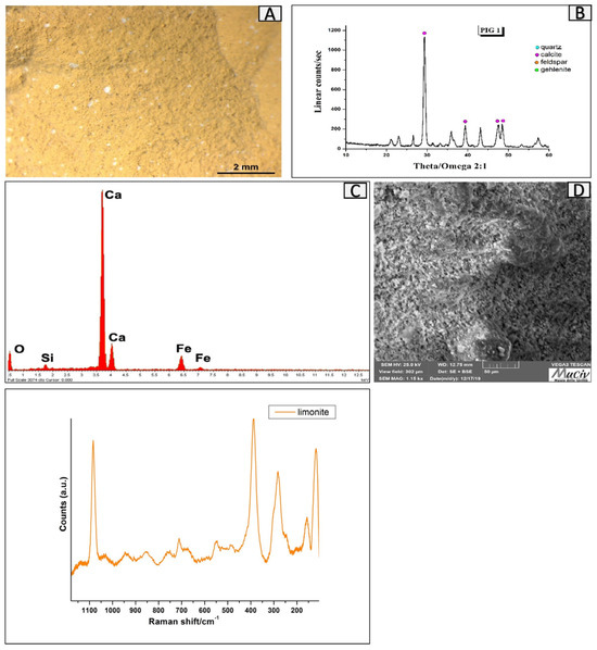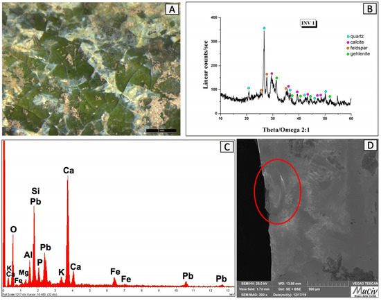 The mineral phases present in the glassy layer can be observed in the XRD spectrum (Figure 13B). The significant abundance of quartz (SiO2) is linked to the probable presence of remains of the glassy coating as well as the ceramic body. Quartz is found in association with the minerals calcite (CaCO3), feldspar-albite (NaAlSi3O8), and gehlenite (Ca2Al(AlSi)O7).
