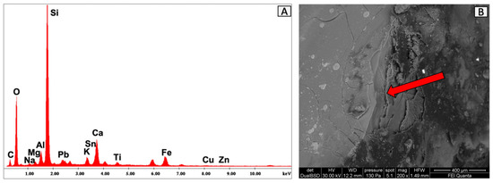 Surface analysis of VET1 glass. The EDS area analysis (A) detected the presence of silicon oxide and traces of sodium oxide and aluminium oxide. (B) Backscattered SEM image where the glass fractures of the VET1 fragment can be observed.