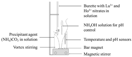 Ho-doped Lu2O3 nanopowders were synthesized by inverse co-precipitation. Rare-earth nitrates were used as precursor and ammonium bicarbonate as precipitant. Commercial oxides of Lu2O3 and Ho2O3 (AUER REMY, Lehvoss group, Hamburg, Germany) were first dissolved in hot nitric acid (HNO3, 65 vol.%, Thermo Fisher Scientific, Waltham, MA, USA). The nitrate solution was poured drop by drop at a rate of 3 mL·min−1 into the solution of ammonium bicarbonate (NH4HCO3, 99wt.%, Acros Organics, Thermo Fisher Scientific, Waltham, MA, USA). The co-precipitation was operated at room temperature with vortex stirring according to the set-up described in Figure 1.