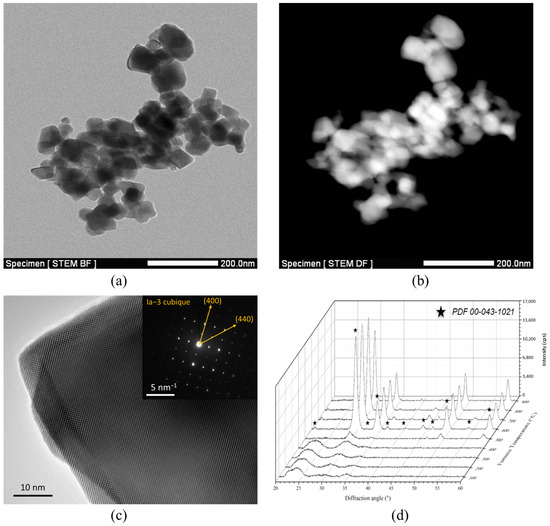 The TEM observations reported in Figure 2a show a slightly edged shape and narrow size distribution of particles with a mean diameter of about 63 nm. No holmium segregation in the form of isolated Ho2O3 particles was detected, as illustrated by the STEM micrograph in Figure 2b. That means there is no differential precipitation of Ho and Lu cations during the synthesis process. The particles also appeared well crystallized in the bixbyite structure (Ia-3, cubic C-type), as revealed by diffraction pattern (Figure 2c). As a result, the Ho:Lu2O3 nanopowder can be considered as a Lu(2−x)HoxO3 homogeneous solid-solution (x = 0.02 for 1 at.% holmium doping content) with a cubic crystalline structure. The diffraction patterns registered as a function of the calcination temperature in Figure 2d also prove that the powder is single phased in the bixbyite structure and well crystallized for temperatures higher than 600 °C. A calcination temperature of 1000 °C was chosen regarding the higher crystallinity of the powder particles at this temperature.