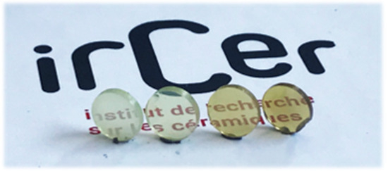 Prior to optical characterizations, the samples were ground to obtain flat and parallel surfaces and then mirror polished with 30 nm colloidal silica after pre-polishing with SiC papers and diamond pastes. A Cary 5000 spectrophotometer was used to record the transmission curves of transparent samples (Agilent, Santa Clara, CA, USA). The spectra resolution was 1 nm with an integration time equal to 0.1 s.