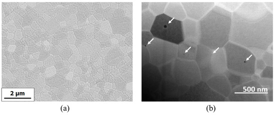 The SEM micrographs taken for the 1 at.%Ho:Lu2O3 sample (Figure 4a) showed a dense microstructure with a small and homogeneous grain size in the order of 200–500 nm. Nevertheless, few intergranular and/or intragranular residual pores were also found, especially by the TEM observations (Figure 4b). Their diameter did not exceed 50 nm and their concentration was estimated to be 90 pores·µm−3. These defects could be related to the presence of microstructural inhomogeneities in powder compacts before sintering and/or rapid grain growth [31]. In fact, it has been highlighted in a previous paper that grain growth starts to be significant for temperatures higher than 1300 °C in such ceramics during sintering by SPS, independently of the applied pressure [32].