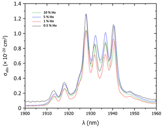 The data reported in Table 1 were used to plot the evolution of the absorption cross-section in the wavelength range 1900–1960 nm for all samples (Figure 6). It was shown that the curves seemed to follow the same evolution of σabs whatever the doping rate. Moreover, they overlapped despite a slight offset for 0.5% and 5%, which was obviously caused by a lower transmittance baseline (i.e., higher scattering by residual porosity) obtained for both samples. However, for the samples with low residual scattering, the calculated value of σabs was approximately 1 × 10−20 cm2 at 1927 nm, which corresponded to the measured data for some Ho-doped systems, for example Ho:YAG [35].