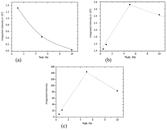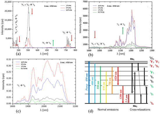 In the Visible range, the emission bands symbolized by red arrows presented a strong decrease when the doping rate increased, with an extinction at 10 at.%Ho (Figure 7a). The identified transitions were 5F3 + 5F2 + 3K8→5I8 at 480 nm, 5F4 + 5S2→5I8 at 550 nm and 5S2→5I7 at 750 nm. However, the transition at 650 nm corresponding to 5F5→5I7 was the only one to increase when the Ho3+ content increased. This change in the relative lines intensity was also observed in the Near-IR range, where the transition 5F4 + 5S2→5I6 at 1020 nm decreased, whereas the one at 1200 nm, associated with 5I6→5I8, increased until Holmium doping reached 5%. A maximum of the 5I7→5I8 transition in Mid-IR at 1.8–2.1 µm was observed for the same Ho3+ content (Figure 7b,c).
